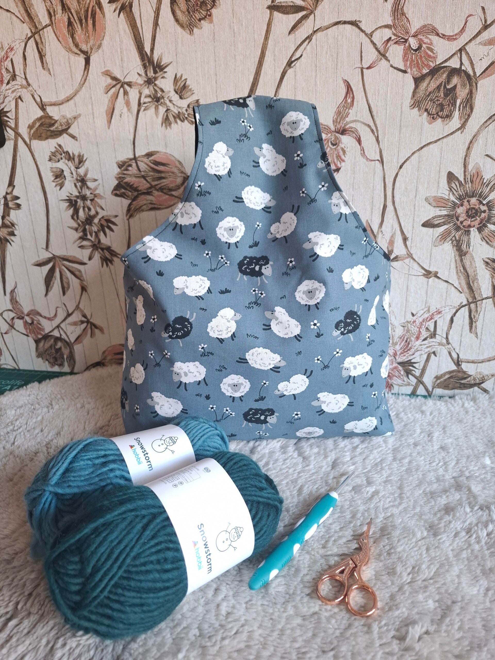Deze brei-tas is gemaakt van 2 verschillende stoffen en biedt voldoende ruimte aan de binnenkant. Zo is er ruimte voor een schaartje, haak- of rondbreinaalden en een meetlint. Ook heeft de tas een ring voor je steekmarkeerders. Er passen zeker 5-6 bolletjes katoen van 50 gram in deze tas plus je projectje.