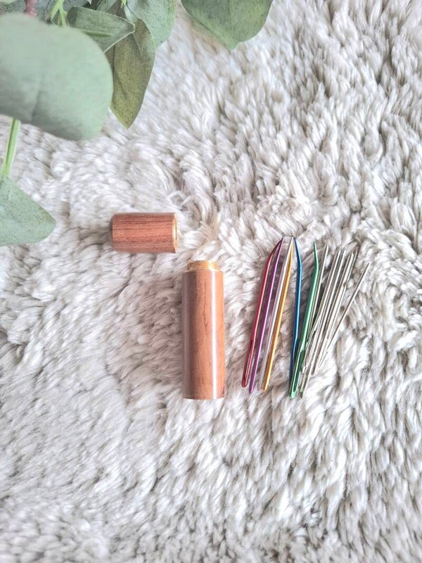 Een handige houten koker met schroefdraad. De koker bevat 12 verschillende stopnaalden voor het afwerken van je draden in je haak- en breiwerk.