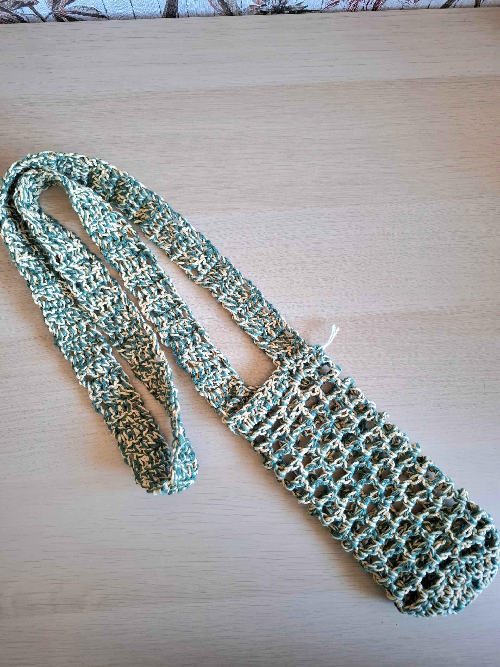 Deze waterfles houder, geschikt voor plastic en glazen flessen met een diameter van max 6 cm en een hoogte van 20 cm, is ideaal voor tijdens een wandeling. Je hangt hem over je schouder of crossbody en je hebt je handen vrij voor andere dingen. De schouderband heeft een lengte van 120 cm. Gehaakt in katoen in de kleuren geel en groen.